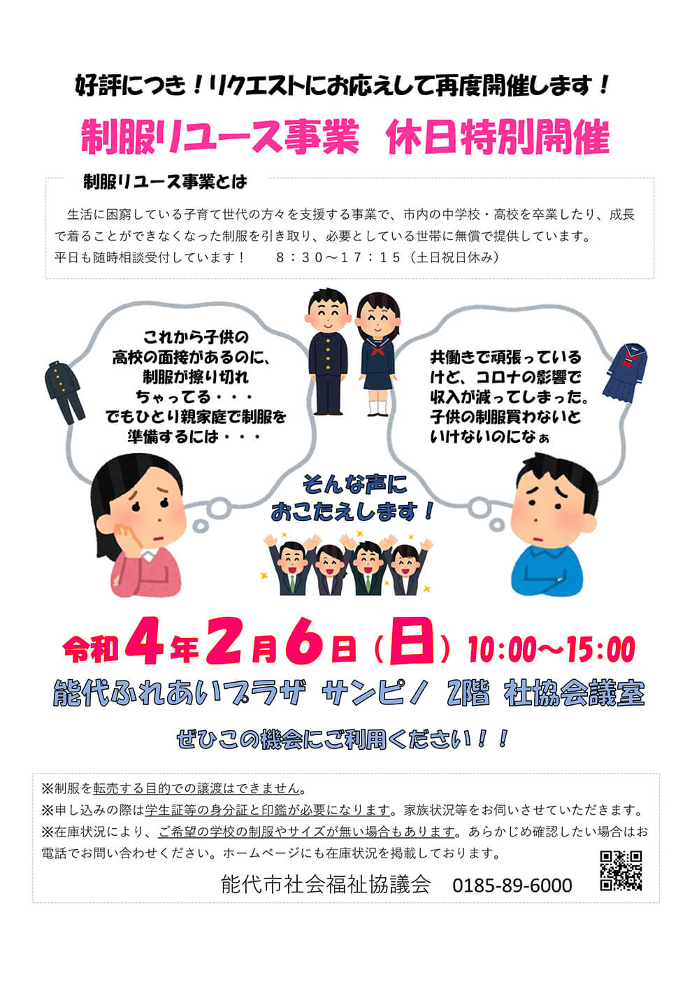 お知らせ 【※終了しました】制服リユース事業休日特別開催のお知らせ 2022.01.14 制服リユース事業 休日特別開催! 令和4年2月6日(日)、ふれあいプラザサンピノにて、「制服リユース事業」を特別開催します。 「平日は難しい」という方、ぜひこの機会にご利用ください! 詳しくは下記チラシをご覧ください。 ダウンロードはこちら Tweet Share Hatena Pocket RSS feedly Pin it 制服リユース事業 制服の在庫状況をお知らせします ボランティア通信 第149号(令和4年2月発行)