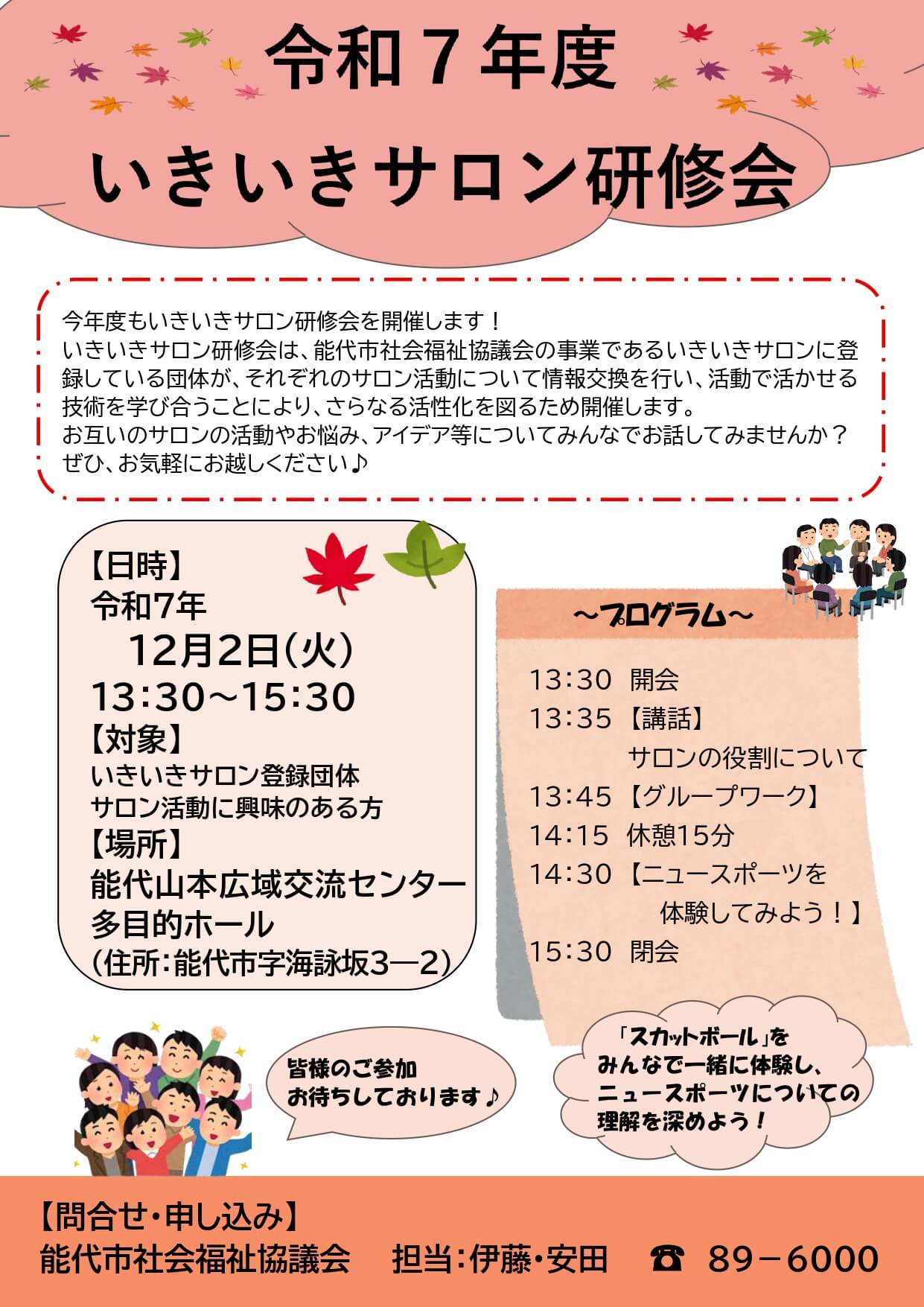 お知らせ 令和7年度いきいきサロン研修会を開催します! 2025.11.28 令和7年12月2日(火)能代山本広域交流センターにて、令和7年度いきいきサロン研修会を開催します。 サロン活動を行っている方、サロンに興味がある方、これから始めようと思ってる方など、どなたでも大歓迎です。 詳しくはチラシをご覧ください。 たくさんの地域の皆さんのご参加をお待ちしております! Tweet Share Hatena Pocket RSS feedly Pin it 能代市社協だより No.94(令和7年11月25日発...