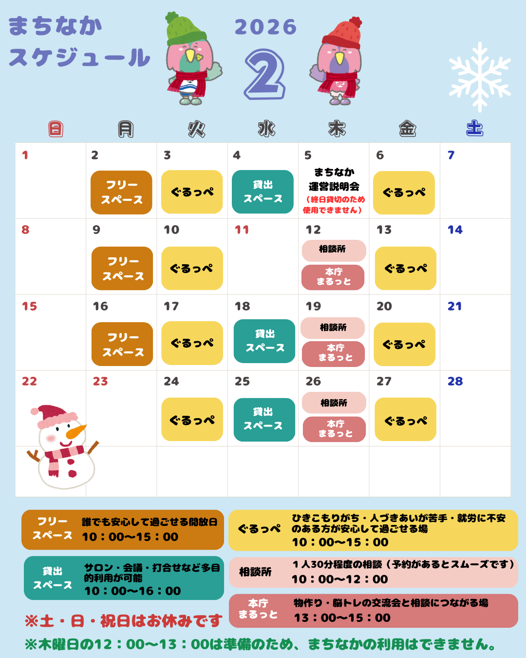 お知らせ まちなかリニューアルオープンします♪ 2026.01.30 いつもまちなかをご利用いただき、ありがとうございます! 2月より、柳町の「まるっとステーションまちなか」を再開します! 安心して過ごせる場所づくりを大切にしながら、ほっとできる時間や、ちょっとした空間が生まれるような空間を整えてお待ちしています♪ 2月のカレンダーも掲載していますので、気になる日があればお気軽にお問い合わせください! 新しくなったまちなかで、地域の皆さんとお会いできることを楽しみにしています! (※曜日によって、利用できない日もございますので、カレンダーをご確認ください) 【問合先】 能代市社会福祉協議会 ☎0185-89-6000 Tweet Share Hatena Pocket RSS feedly Pin it みんなの相談窓口「まるっとステーション」2月の日程