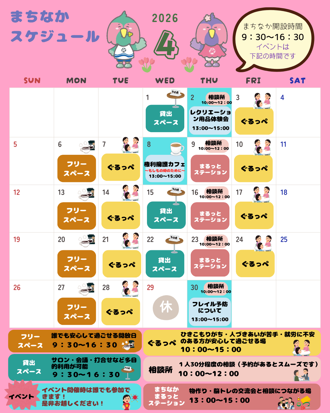 お知らせ 「まるっとステーションまちなか」4月のスケジュール 2026.03.30 「まるっとステーションまちなか」は、地域の皆さんの悩みや困りごとを「丸ごと」受け止める相談窓口として、また、気軽に集い交流する「居場所」として、自由で開放的な空間を感じ利用できる場所です! 4月のカレンダーを掲載していますので、気になる日があればお気軽にお問い合わせください♪ (※曜日によって、利用できない日もございますので、カレンダーをご確認ください) 【問合先】 能代市社会福祉協議会 ☎0185-89-6000 Tweet Share Hatena Pocket RSS feedly Pin it みんなの相談窓口「まるっとステーション」4月の日程