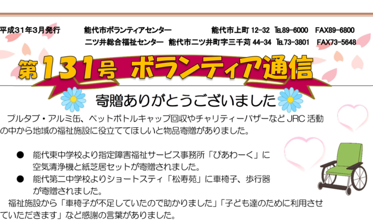 ボランティア通信 第131号(平成31年3月発行)を掲載しました。 ダウンロードはこちら