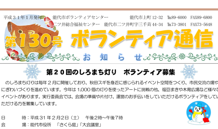 ボランティア通信 第130号(平成31年1月発行)を掲載しました。 ダウンロードはこちら